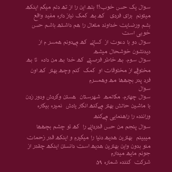 پس از جمع آوری پاسخ ها، تعدادی از همکاران و دوستان به پاسخ های داده شده رای دادند. بر اساس رای ها خانم رقیه- شرکت کننده شماره ۵۹ برنده مسابقه شدند.
