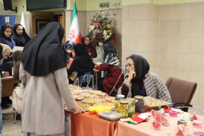 عکس دوم: میز ثبت نام در مراسم و من در حال گفتگو با سر کار خانم قلیزاده، کارشناس مامایی که به من در پیدا کردن مراقبین خانوادگی سالمندان منطقه ۱۶ کمک کردند.